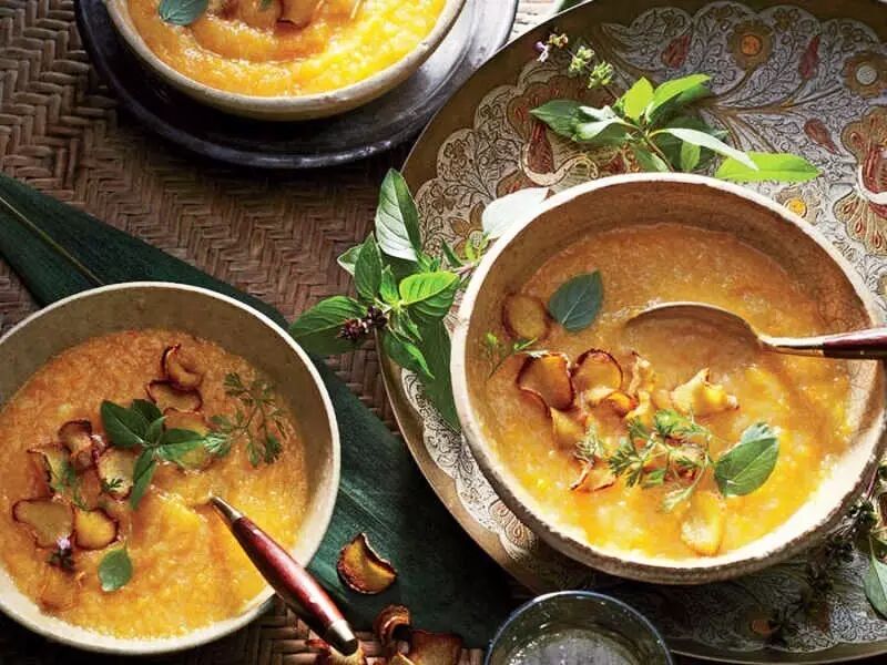 在锅中倒入油,中火,加入粥和南瓜块,煮1-2分钟,加入鸡汤和1cup水、鱼露,煮沸,中小火,继续炖煮75分钟,持续搅拌